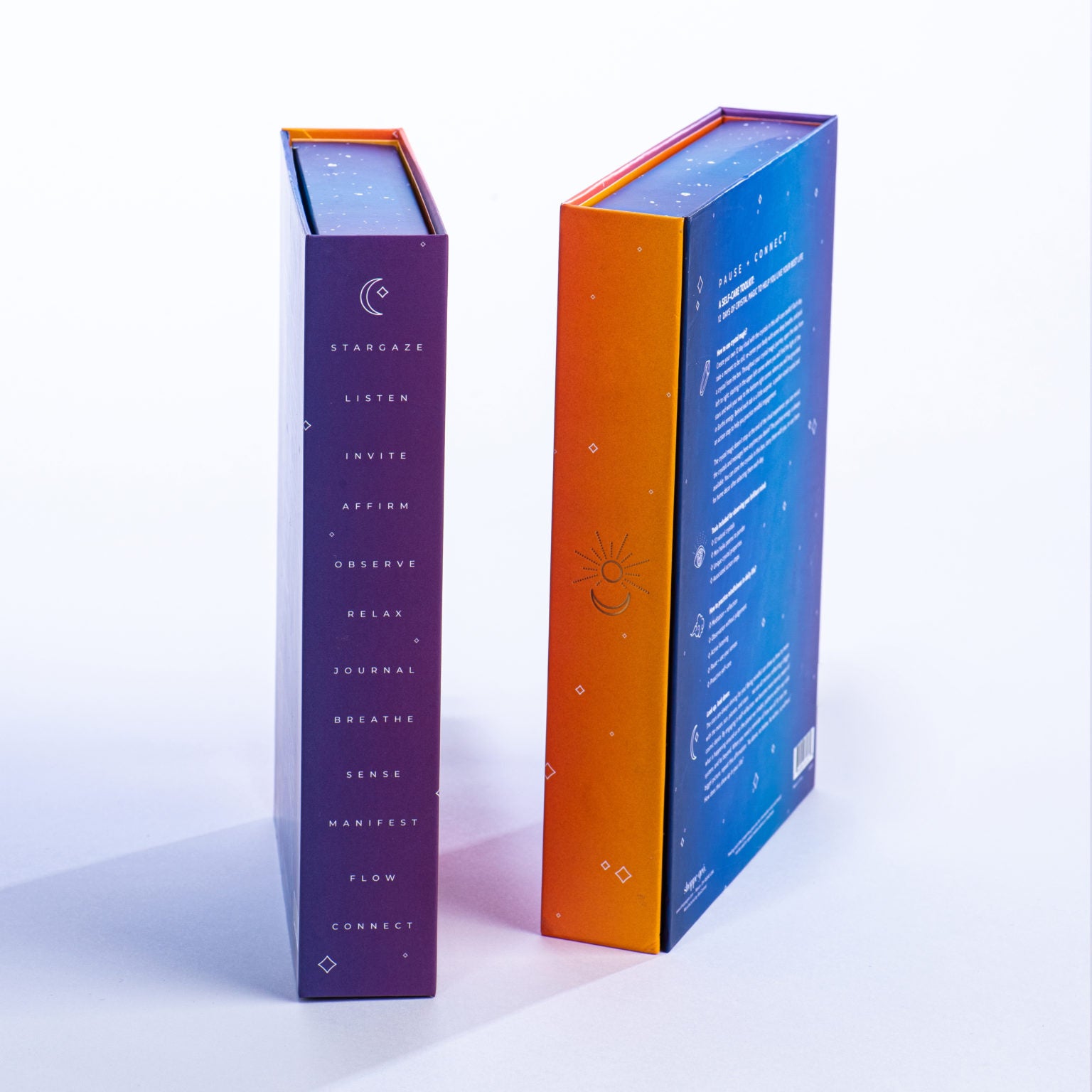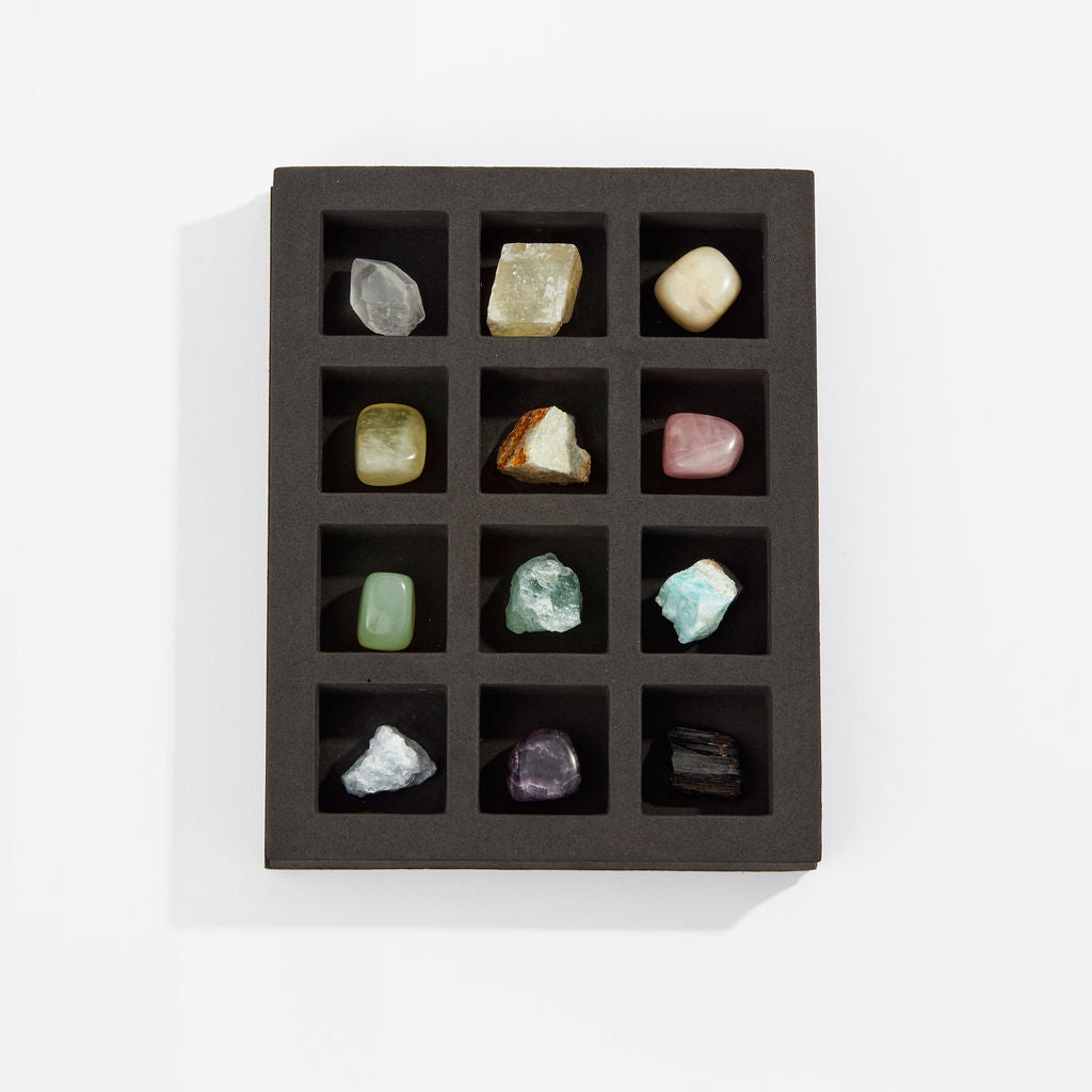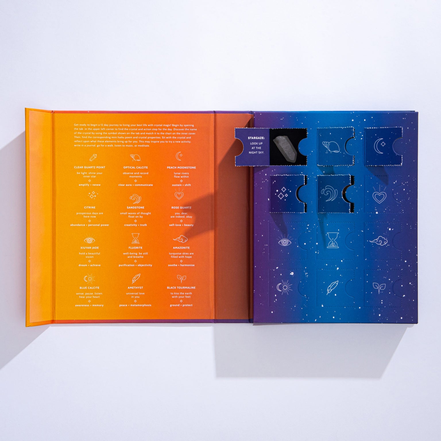A bright and radiant 12 piece advent calendar style box with crystals, inspirational messages, and action steps for a self-care journey. Packaging features metallic gold foil accents and modern graphic design.