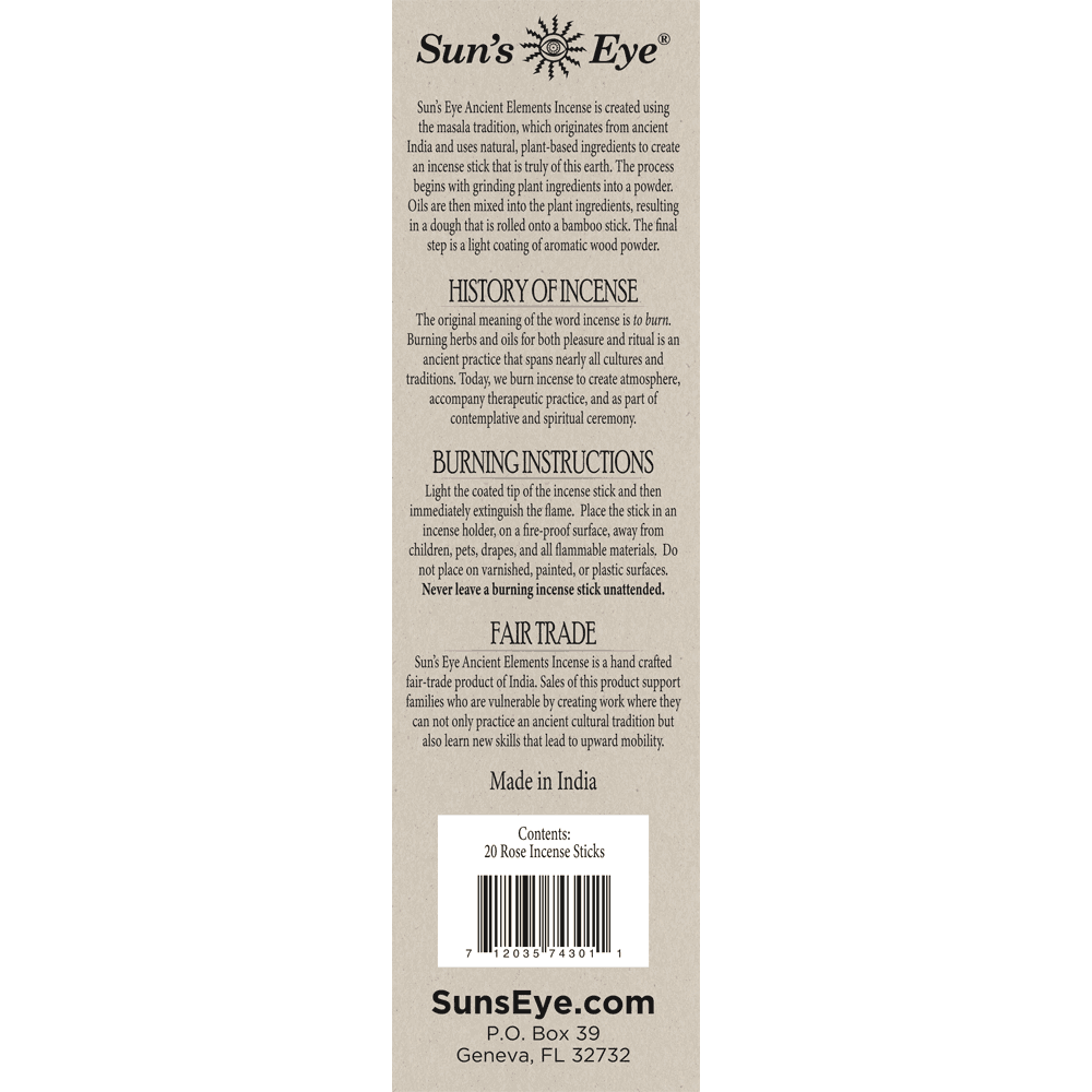 Sun’s Eye Ancient Elements Incense is created using the masala tradition, which originates from ancient India and uses natural, plant-based ingredients to create an incense stick that is truly of this earth. The process begins with grinding plant ingredients into a powder. Oils are then mixed into the plant ingredients, resulting in a dough that is rolled onto a bamboo stick. The final step is a light coating of aromatic wood powder.